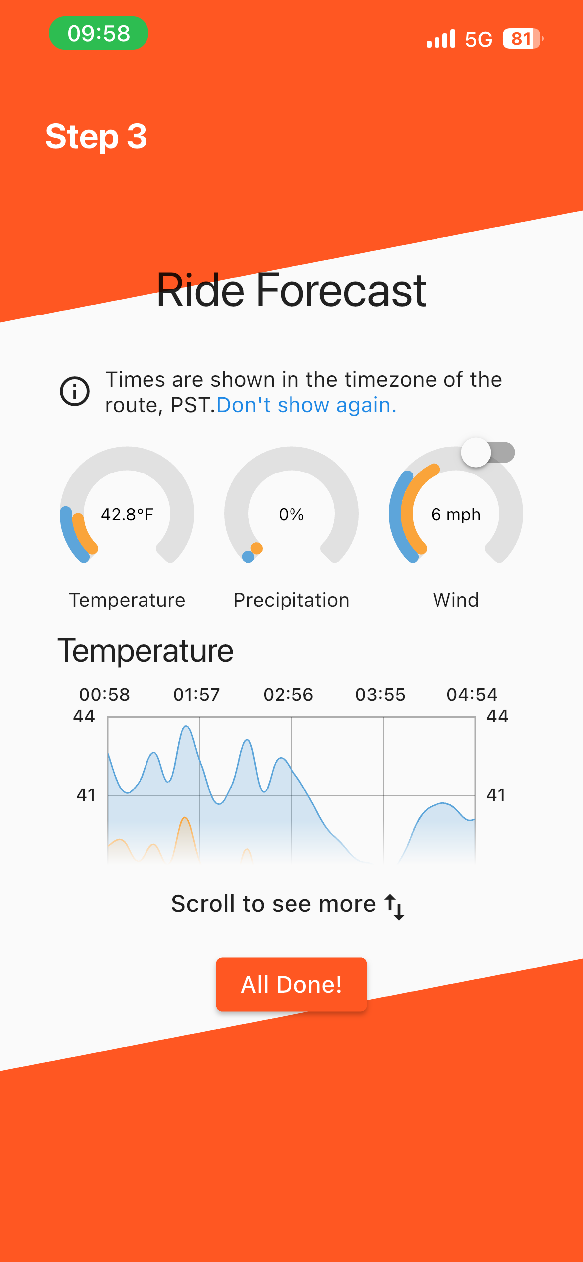 4. Look for rain or storm cells along the timeline of your ride